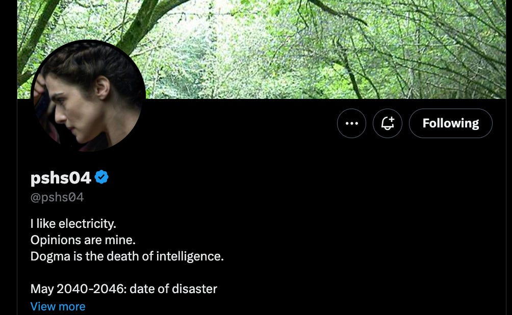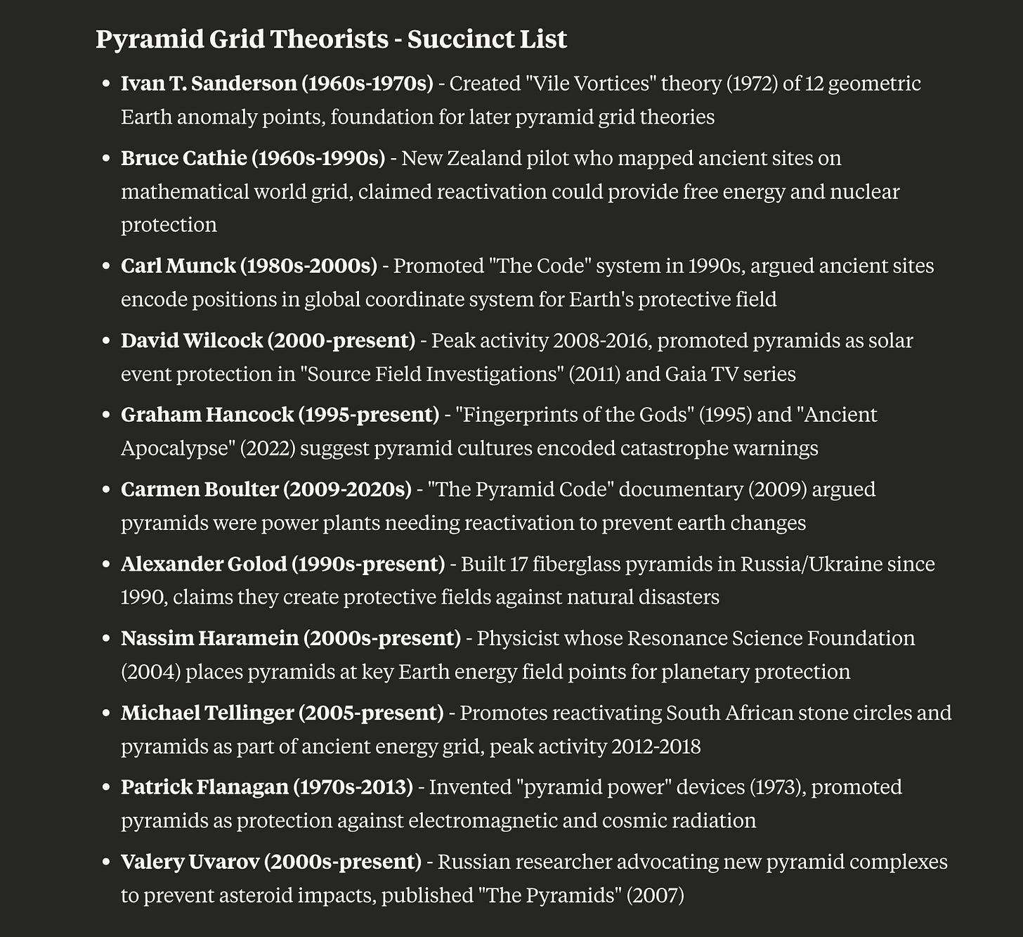 , about pyramidal structures as functional resonant devices and in her bio on X.com, she seems to predict the cataclysm is coming 2040-2046. So her pyramidal urges also seem linked to the cataclysm. (Correction: she also sees the Pyramid as the solution for the predicted cataclysm, hence her dedicated research into the domain.)I had also noticed schizo philosopher, @DionysianAgent totally Egypt-maxxing. These are some of the newer, younger personalities now entering the picture. But neither of them are yet really talking about building or activating a global pyramid grid?
